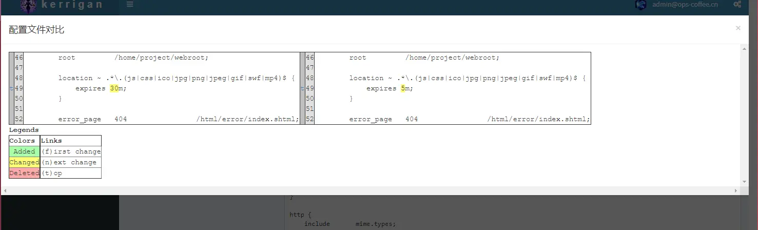 系统中多次出现“对比”功能,都指的是当前配置文件和已发布配置文件的对比,通过对比可以清晰的看出修改的内容,对比结果展示如下