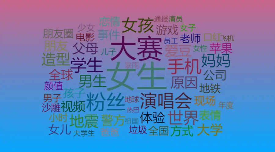 可以看出,“女生”这个词是热搜中出现最多的名词,为了一探究竟,我们再看看具体都涉及哪些事件呢