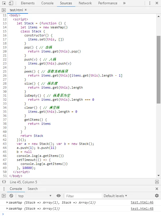 这个栈函数就是一个利用WeakMap弱引用的绝佳例子: