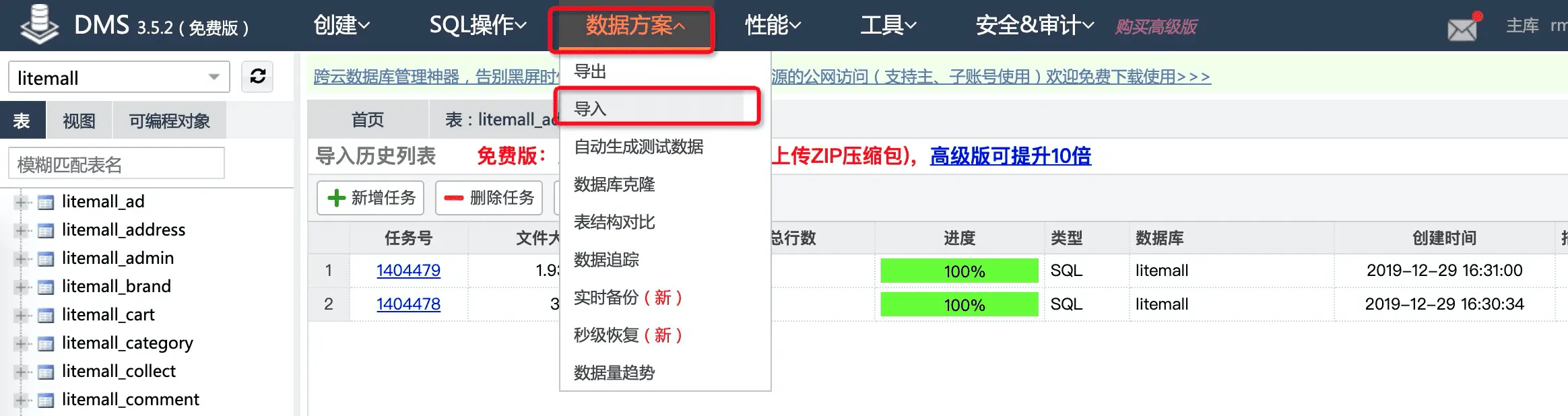 在 MYSQL 数据库上创建一个名为 litemall 的 database,然后将 litemall-db/sql 中的 litemall_table.sql 以及 litemall_data.sql 两个文件导入到该数据库中。