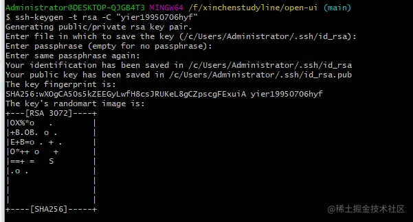 2.可以用: ssh-keygen -t rsa -C "GitHub账号" ,一直Enter下去生成公钥如下所示: