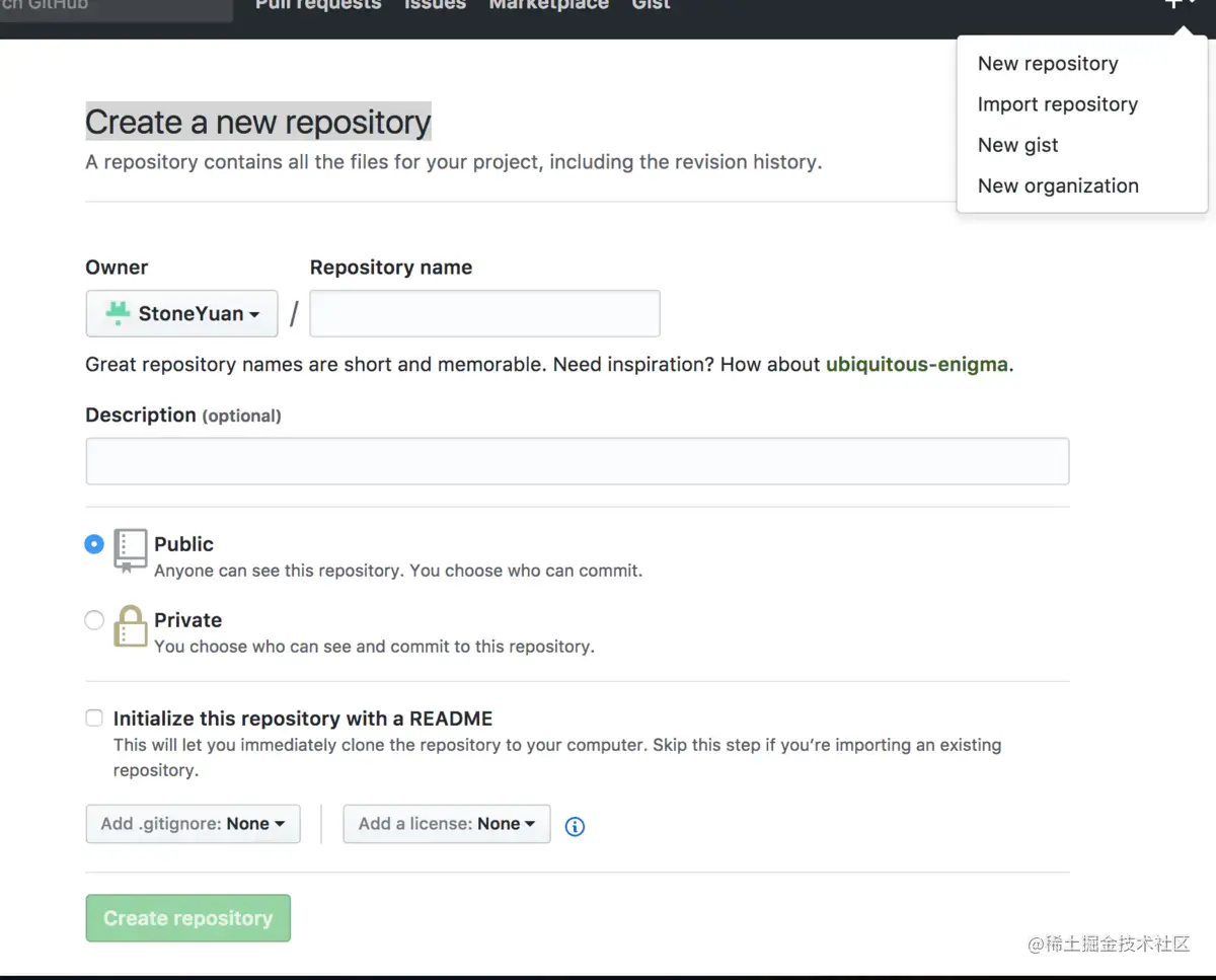 第四步:去github上创建自己的repository,点击个人头像旁边的加号 如下图所示: