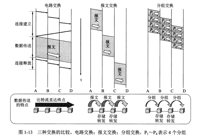 分组交换——单个分组(这只是整个报文的一部分)传送到相邻结点,存储下来后查找转发表,转发到下一个结点。