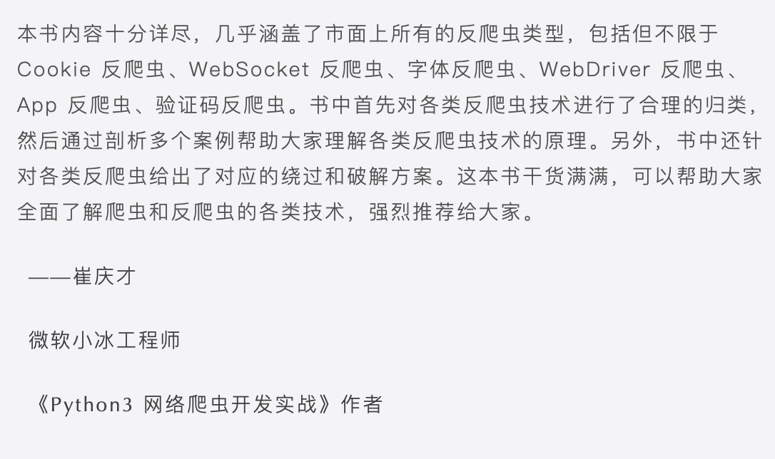 今天给大家推荐业内深受欢迎的反爬虫专题书籍《Python3 反爬虫原理与绕过实战》