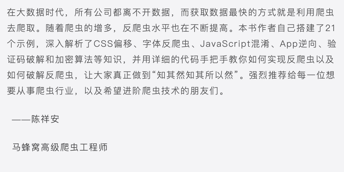 反爬虫的设计者和实施者遍布于各个岗位,它可以是前端工程师、后端工程师、移动端研发甚至是产品经理。他们能够从书中了解到爬虫工程师常用的技术手段和思路,知道哪些防护措施容易被突破、哪些措施的绕过难度会更高以及如何限制爬虫,从而设计出适合的反爬虫策略。