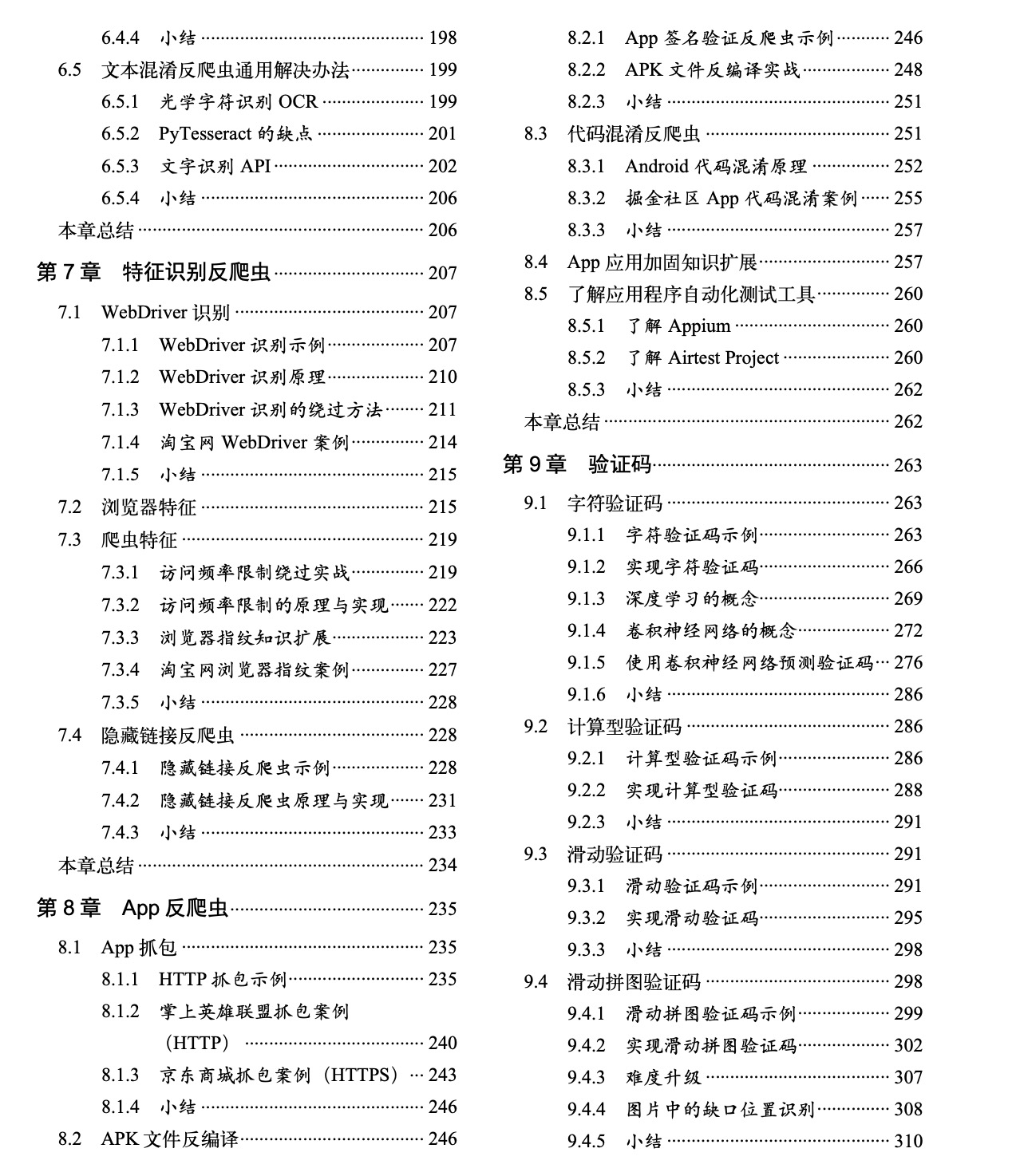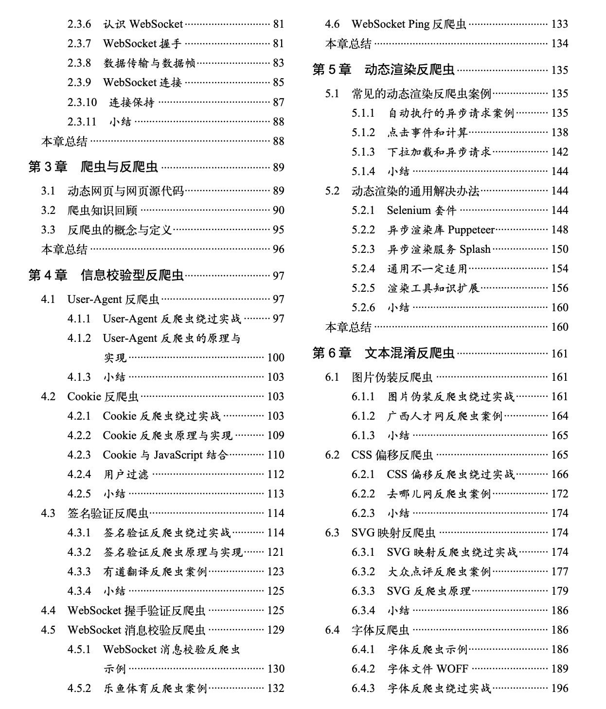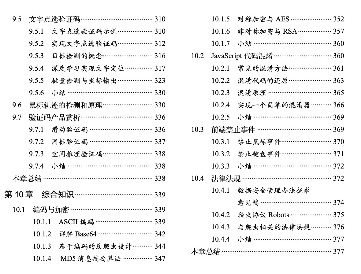 书中描述了爬虫技术与反爬虫技术的对抗过程,并详细介绍了这其中的原理和具体的实现方法。本书从开发环境的配置到 Web 网站的构成和页面渲染,再到动态网页和静态网页对爬虫造成的影响。然后介绍了不同类型的反爬虫原理、具体实现和绕过方法。书中还讲解了常见验证码的实现过程,并使用深度学习技术完成了验证。最后介绍了常见的编码和加密原理、JavaScript 代码混淆知识、前端禁止事件以及与爬虫相关的法律知识和风险点。