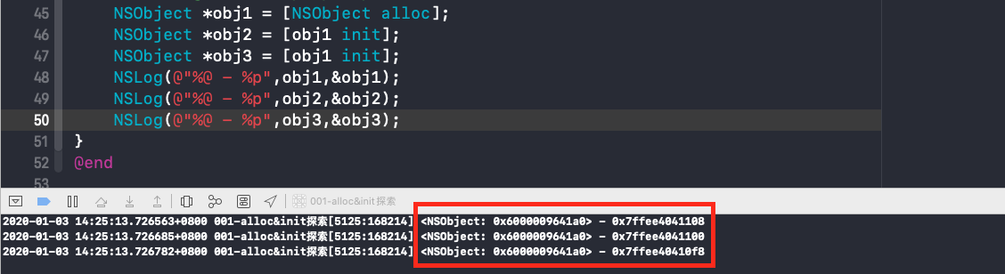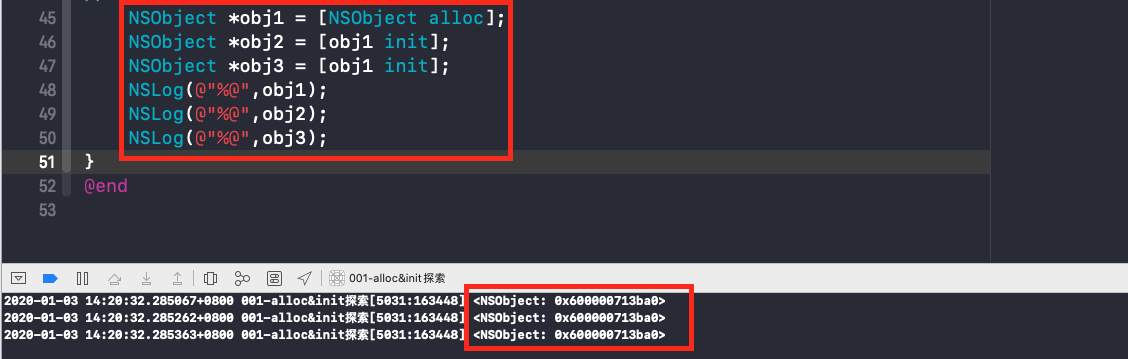 - 我们分别创建3个NSObject对象 如下图方式创建 打印结果这3个对象为同一个对象