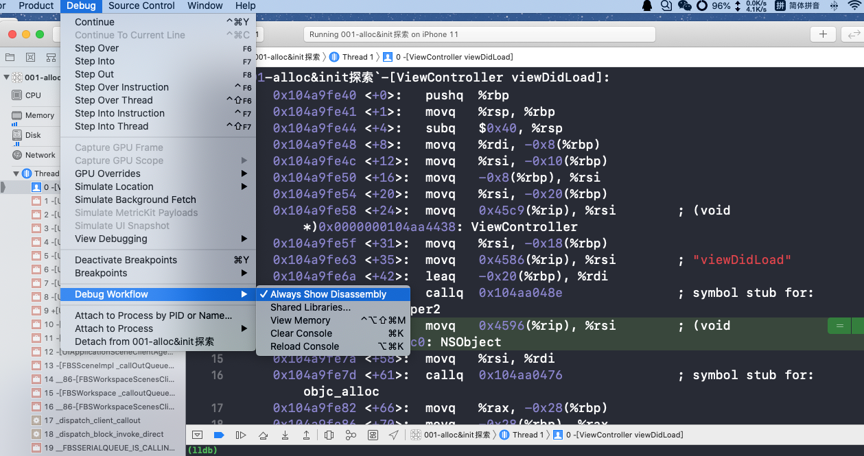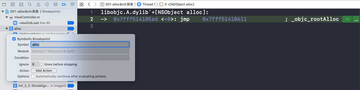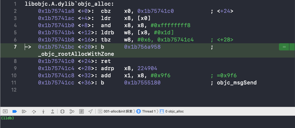 点击Debug->Debug Workflow 选中Always Show Disassembly 可看到objc_alloc 打断点 Control+in 继续走可进入libobjc.A.dylib动态库里