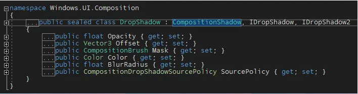 如上图所示,UWP中的DropShadow的Color只能有一种颜色,所以DropShadow不能使用复杂的颜色。这时候就要用到CompositionMaskBrush,CompositionMaskBrush有两个主要属性:Mask和Source。其中Mask是一个CompositionBrush类型的属性,它指定不透明的蒙板源。简单来说,CompositionMaskBrush的形状就是它的Mask的形状。而Source属性则是它的颜色,这个属性可以是 CompositionColorBrush、CompositionLinearGradientBrush、CompositionSurfaceBrush、CompositionEffectBrush 或 CompositionNineGridBrush 类型的任何 CompositionBrush。可以使用前面创建的CompositionDrawingSurface创建出CompositionSurfaceBrush,最后创建一个CompositionMaskBrush,将CompositionSurfaceBrush作为它的Mask。