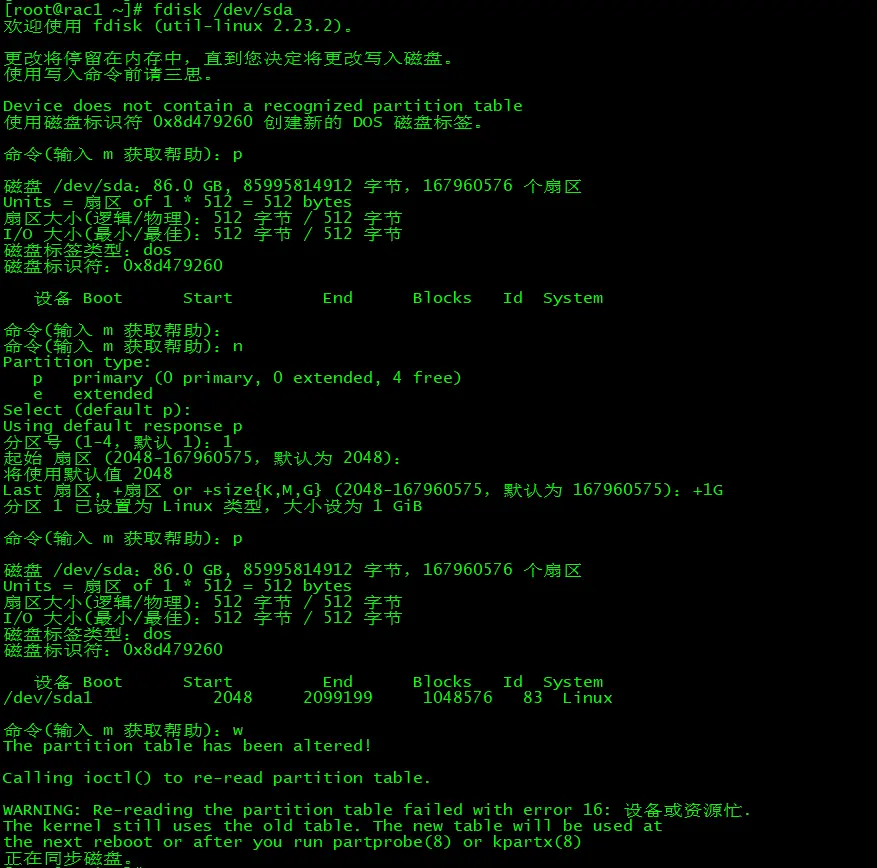 WARNING: Re-reading the partition table failed with error 16: 设备或资源忙. The kernel still uses the old table. The new table will be used at the next reboot or after you run partprobe(8) or kpartx(8) 正在同步磁盘。