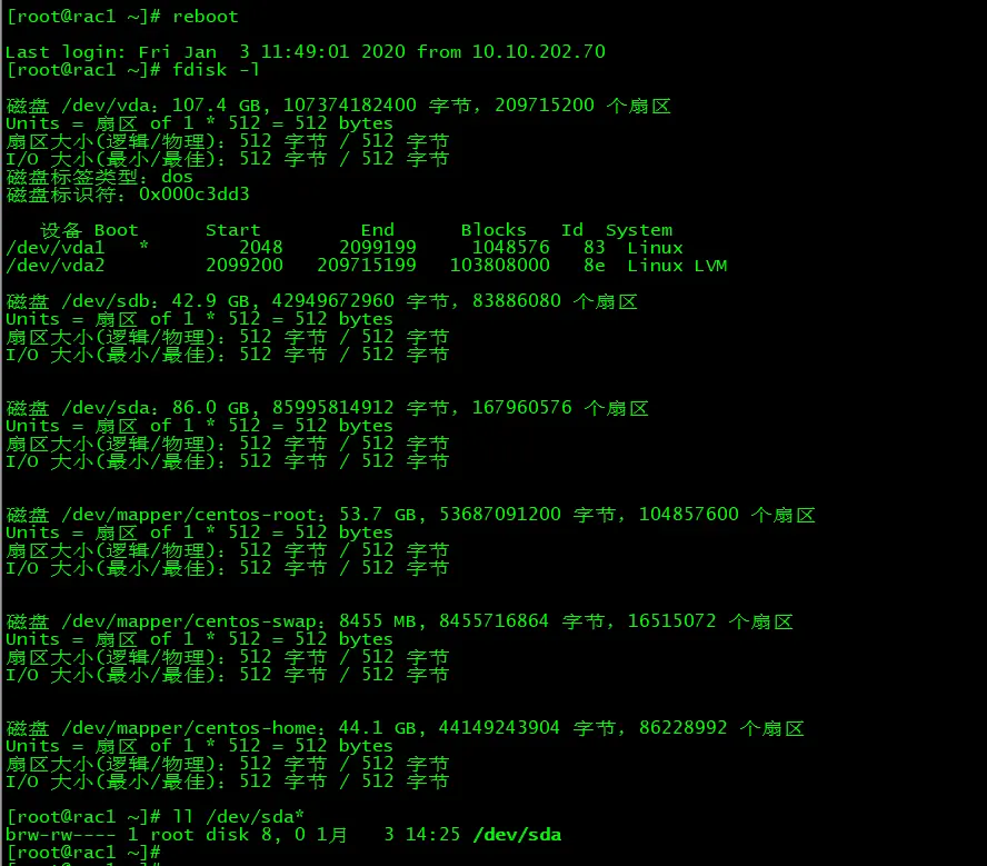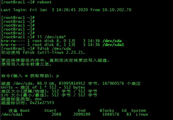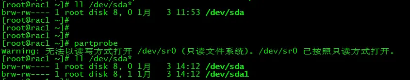 需要搭建一个Oracle11g数据库集群环境,在做磁盘映射时,使用linux命令fdisk对挂载磁盘分区,但是在分区后报错,在/dev目录下无法查看已经分区的列表,节点2同样无法查看分区。需要执行partprobe命令才可以看到分区列表。重启1节点服务器后分区丢失,重启2节点分区不丢失(使用一节点分区)。