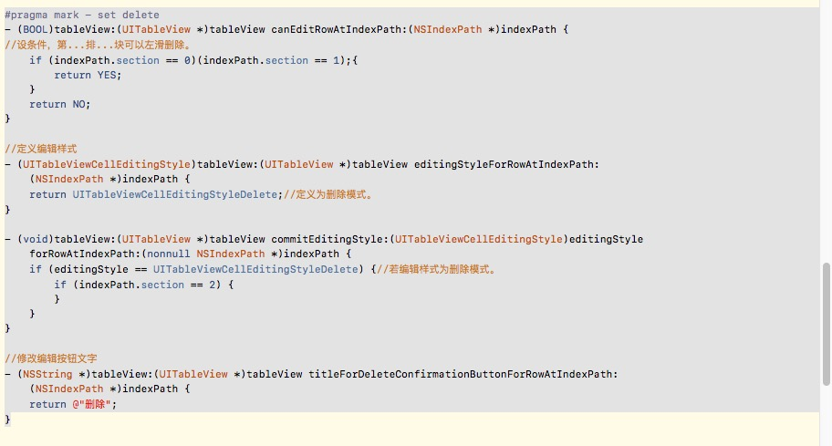(void)tableView:(UITableView *)tableView commitEditingStyle:(UITableViewCellEditingStyle)editingStyle forRowAtIndexPath:(nonnull NSIndexPath *)indexPath { if (editingStyle == UITableViewCellEditingStyleDelete) {//若编辑样式为删除模式。 if (indexPath.section == 2) { } } }