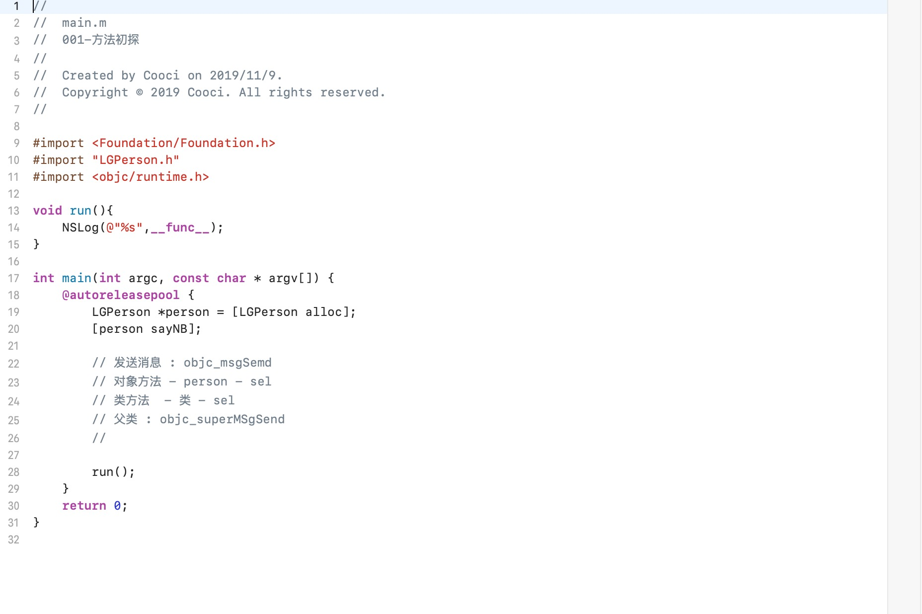 首先我们在main.m 文件里,创建了个LGPerson的对象并调用了sayNB的方法,又写了个C语言函数run,并且调用.好的那我们现在看下底层在编译的时候到底做了哪些处理. 打开终端 输入命令:clang -rewrite-objc main.m -o main.cpp(输出个.cpp编译后的文件)打开main.cpp文件截取其中一段如下: