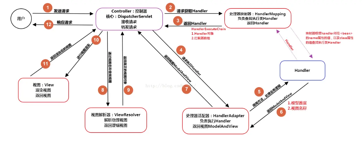 (1)用户发送请求至前端控制器DispatcherServlet; (2) DispatcherServlet收到请求后,调用HandlerMapping处理器映射器,请求获取Handle; (3)处理器映射器根据请求url找到具体的处理器,生成处理器对象及处理器拦截器(如果有则生成)一并返回给DispatcherServlet; (4)DispatcherServlet 调用 HandlerAdapter处理器适配器; (5)HandlerAdapter 经过适配调用 具体处理器(Handler,也叫后端控制器); (6)Handler执行完成返回ModelAndView; (7)HandlerAdapter将Handler执行结果ModelAndView返回给DispatcherServlet; (8)DispatcherServlet将ModelAndView传给ViewResolver视图解析器进行解析; (9)ViewResolver解析后返回具体View; (10)DispatcherServlet对View进行渲染视图(即将模型数据填充至视图中) (11)DispatcherServlet响应用户。