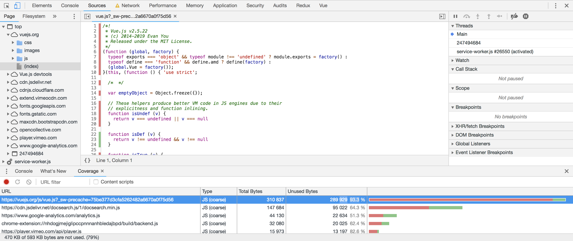 标记为红色的是当前路由不需要的可以延迟加载的内容,如果使用了 source map,可以点击列表中的任一文件,查看哪些部分没有调用。可以看到,即使 vuejs.org 都有很大的改进空间。
