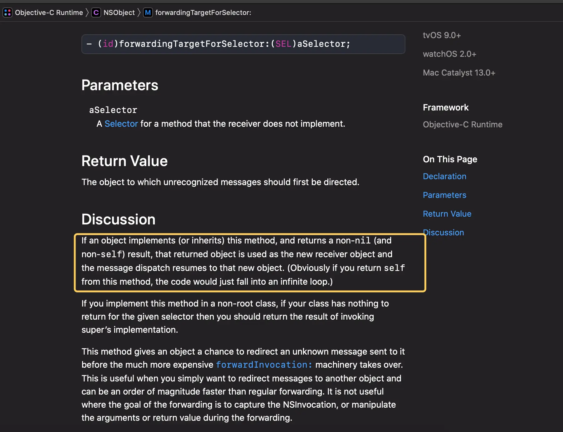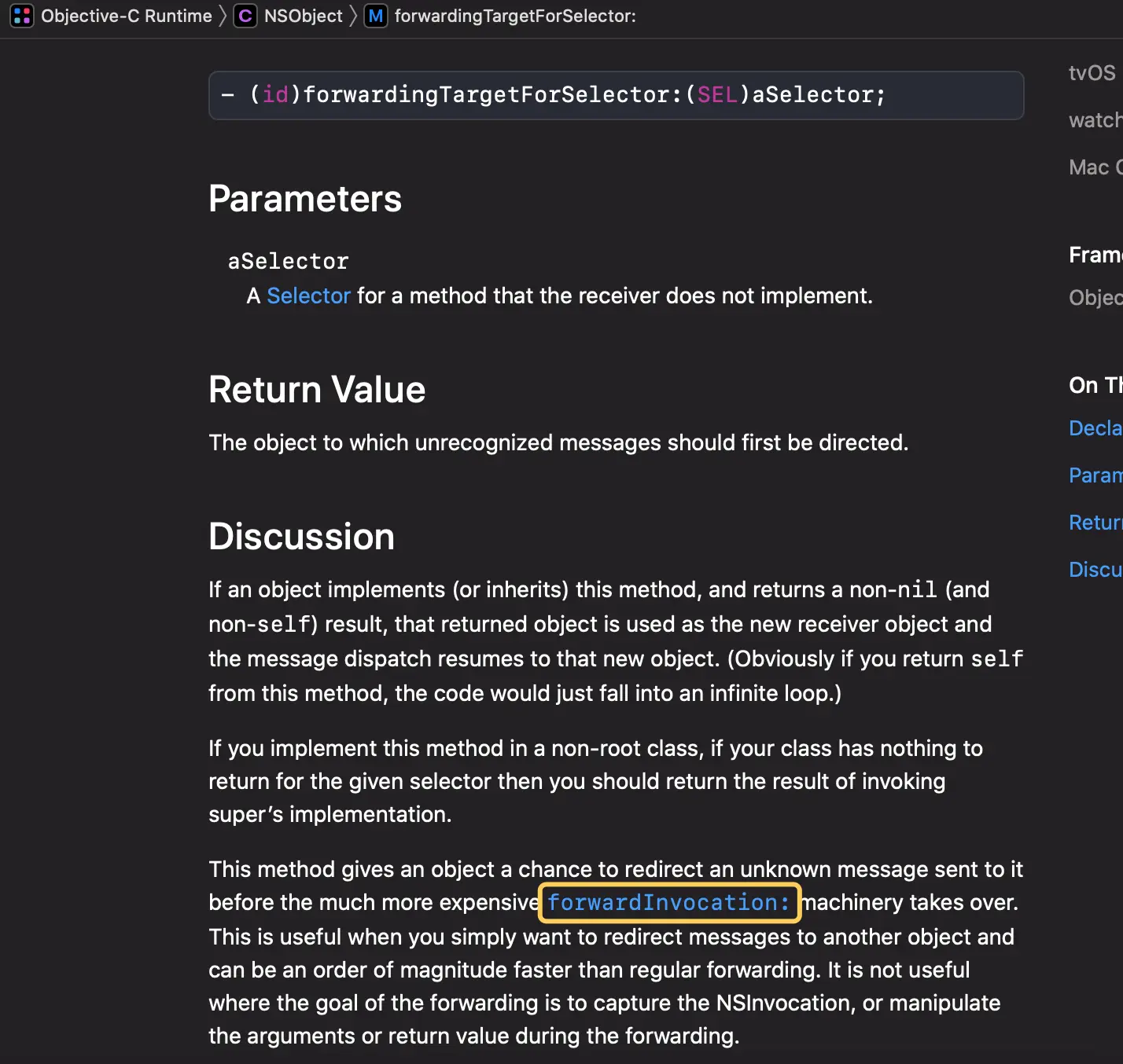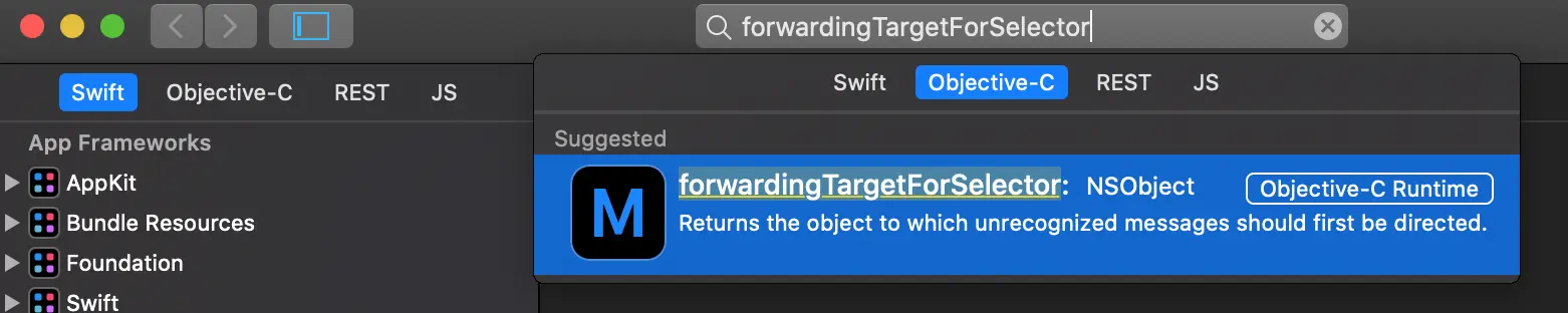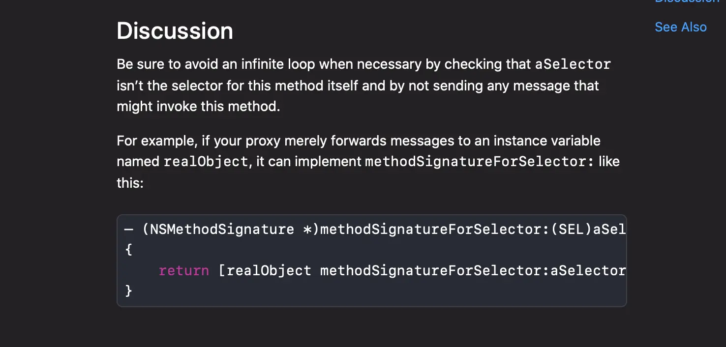 很明显 , 只给苹果一个方法签名是肯定不行的 , 必须要有方法实现啊 , 别急 , 刚刚我们在 forwardingTargetForSelector 的官方文档中看到 , 如果返回 nil 或者不实现 , 则会进入 forwardInvocation: 的流程 .