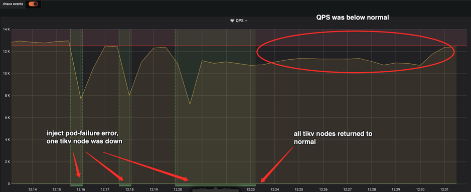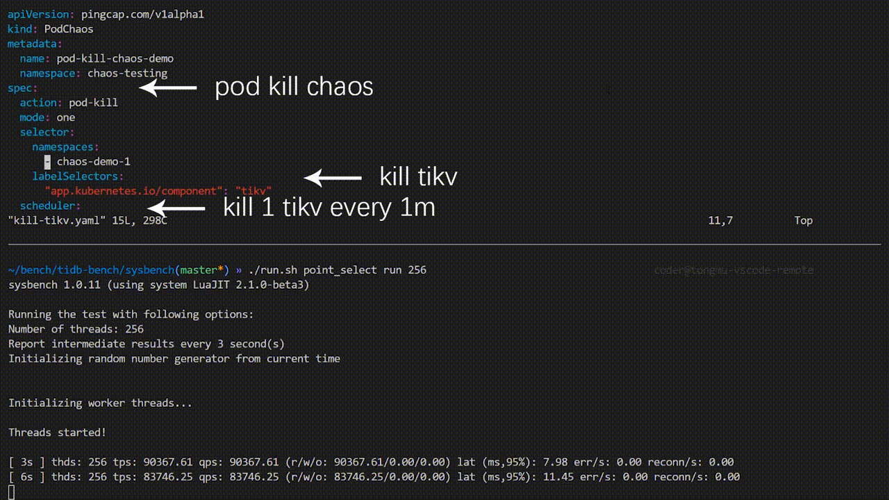 上图 demo 中 sysbench 程序一直在对 TiDB 集群进行测试,当将错误注入到集群后,sysbench QPS 出现明显抖动,观察 Pod 发现,某一个 TiKV Pod 已经被删除,并且 Kubernetes 为了 TiDB 集群重新创建了一个新的 TiKV Pod。