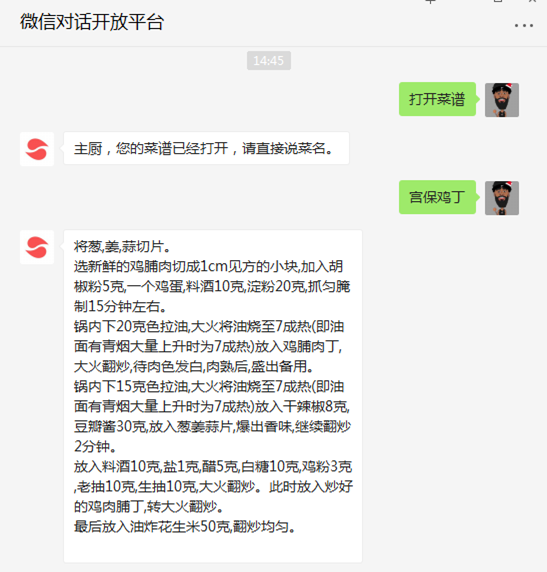 获取家常菜菜谱技能之后,就可以查询几乎所有家常菜的做法;在输入“打开菜谱”的指令后,输入相应菜名即可。