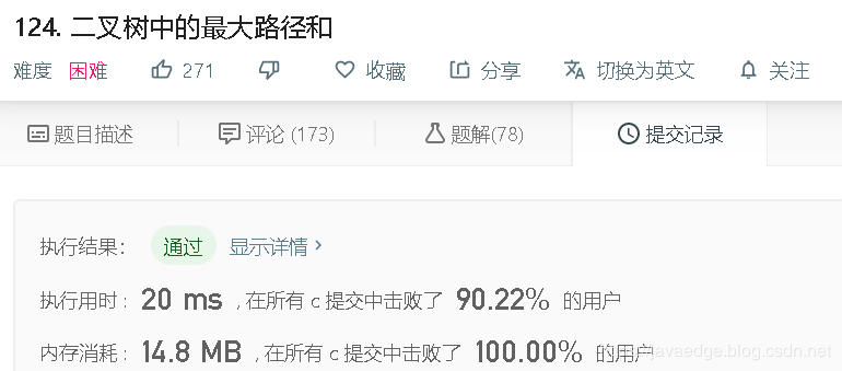其中情况 1,表示如果不联络父结点的情况,或本身是根结点的情况。这种情况是没法递归的,但是结果有可能是全局最大路径和。情况 2 和 3,递归时计算 a+b 和 a+c,选择一个更优的方案返回,也就是上面说的递归后的最优解啦。另外结点有可能是负值,最大和肯定就要想办法舍弃负值(max(0, x))(max(0,x))。