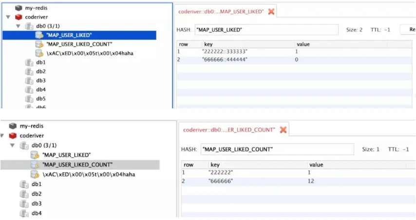 由于需要记录点赞人和被点赞人,还有点赞状态(点赞、取消点赞),还要固定时间间隔取出 Redis 中所有点赞数据,分析了下 Redis 数据格式中 Hash 最合适。
