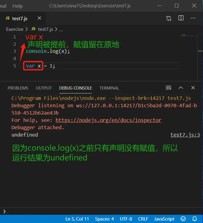 当用var声明变量时,由于js的预解析机制,声明会被提升到当前作用域最前面。