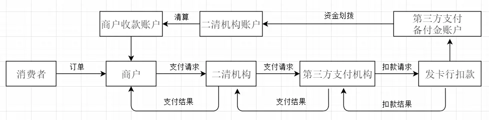 首先,什么是二清?,上图是上篇文章中提到的一个图,描述的是消费者消费后,资金从客户发卡行流转至第三方支付机构备付金账户再到商户的过程,这里的第三方支付机构即是与商户签有协议的收单机构,这里第三方支付机构参与的清算即为“一清”;而二清则是商户和第三方支付机构之间又多出的一个第四方机构参与清算,而这类第四方机构没有支付牌照的,这类公司也是伴随着聚合支付产生的,并且二清承诺商户即时结算、当天到账等诱惑,促使二清交易量巨大,下面是一张“二清”资金流转图: