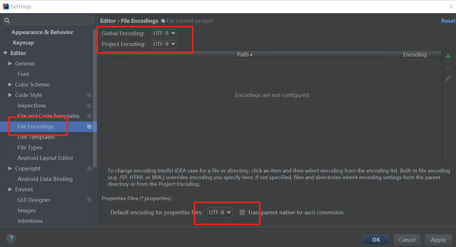 IDE项目中的中文乱码问题?File->settings->Editor->File Encodings,设置一下编码方式utf-8