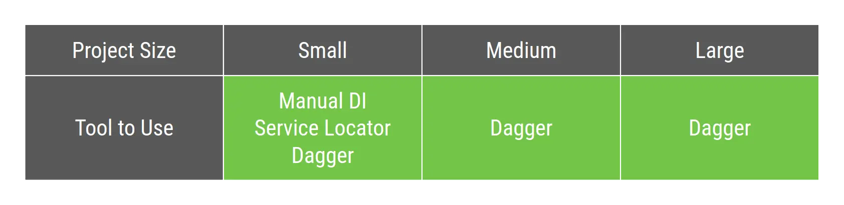 如果要开发外部SDK或库,则应根据SDK或库的大小在手动DI或Dagger之间进行选择。请注意,如果您使用第三方库进行依赖项注入,则库的大小可能会增加。