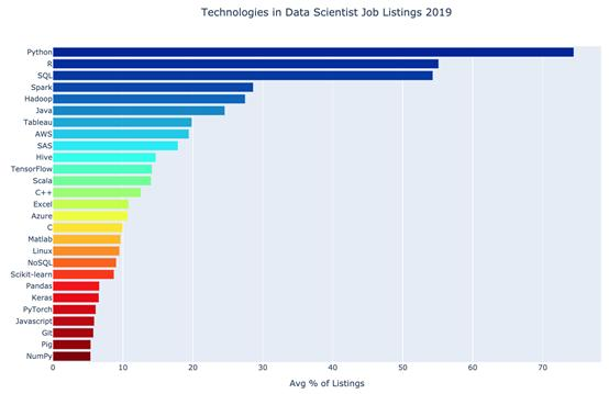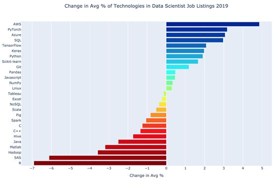 R的总体平均下降幅度最大。鉴于其他调查的结果,这一发现不足为奇。Python很明显已经取代R,成为数据科学的首选语言。尽管如此,R还是很受欢迎,出现于约55%的列表中。如果已经了解R,不要失望,但如果想要获得需求更高的技能,也要考虑学习Python。