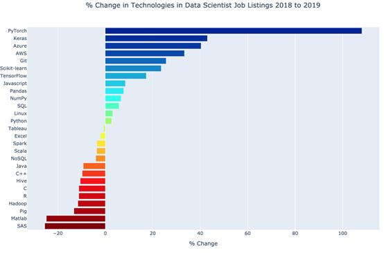 以下是上述第三项的图表,显示了每年的百分比变化。相比2018年列表的平均百分比,PyTorch增加了108.1%。
