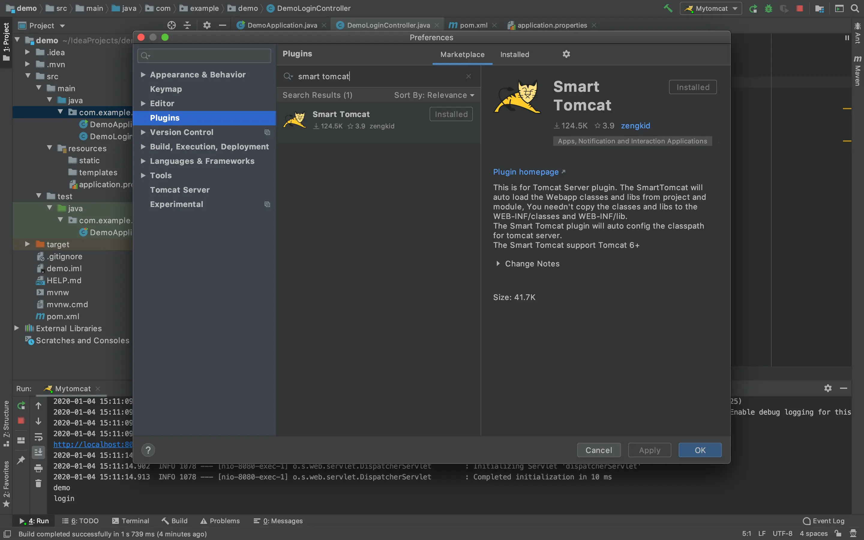 打开Preferences->Plugins 搜索smart tomcat,如下图。安装后重启idea即可。