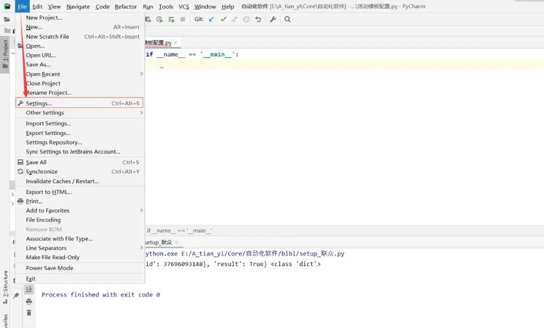 1. 点击pycharm左上角,打开settings,如下图所示。