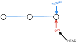 当我们创建新的分支dev时,Git新建了一个指针叫dev,令dev指向master相同的提交,再把HEAD指向dev,就表示当前分支在dev上: