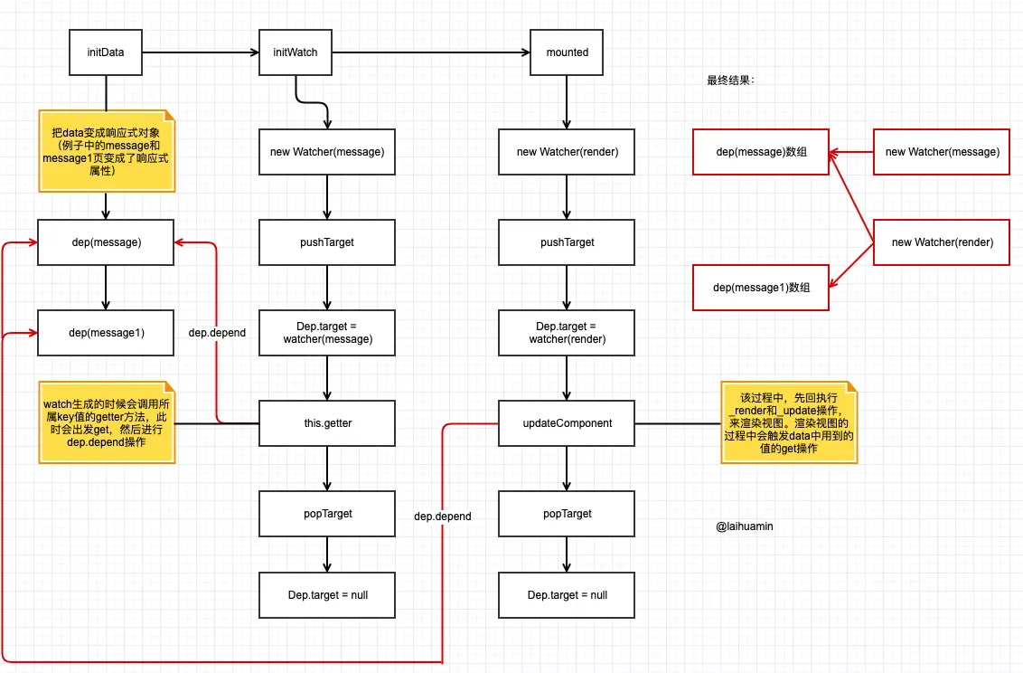 2、视图在渲染过程中,会将renderWatcher收集到用到的值的dep中,方便依赖更新(不懂的在回过去看一下依赖收集流程)