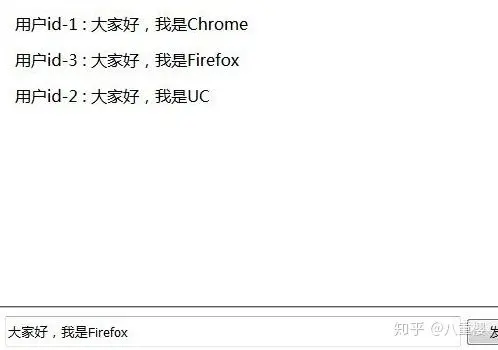 在Chrome浏览器的聊天窗口中,输入“大家好,我是Chrome”,此时,UC和Firefox浏览器的聊天窗口中,将会看到这个信息。同理,在UC和Firefox浏览器的聊天窗口中输入信息,另外两个窗口也是能看到的,下面是其中一个聊天窗口的截图,如下: