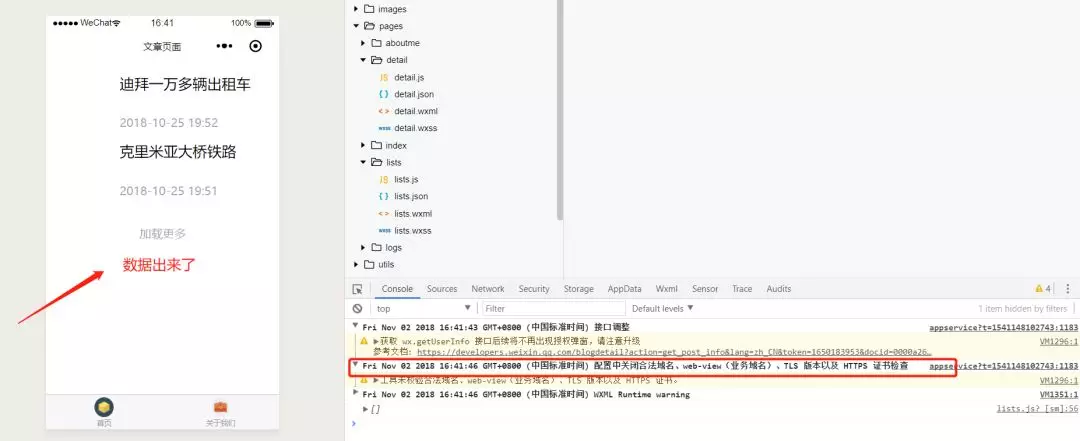 从上图看到数据已经成功获取到了,且控制也没有报错,只是提示:配置中关闭合法域名、web-view(业务域名)、TLS 版本以及 HTTPS 证书检查