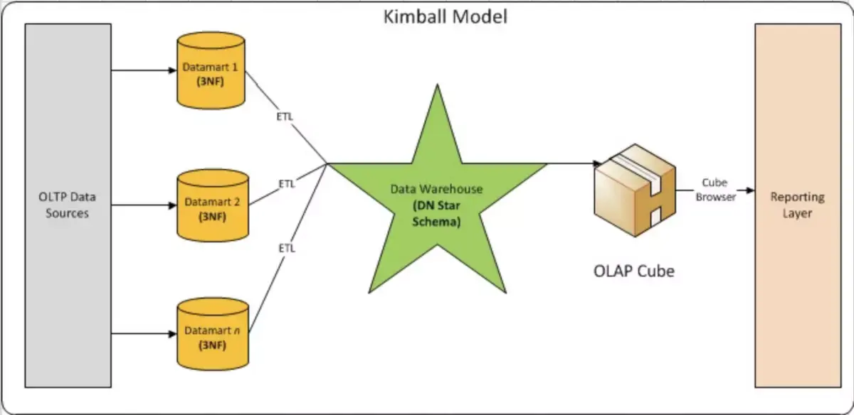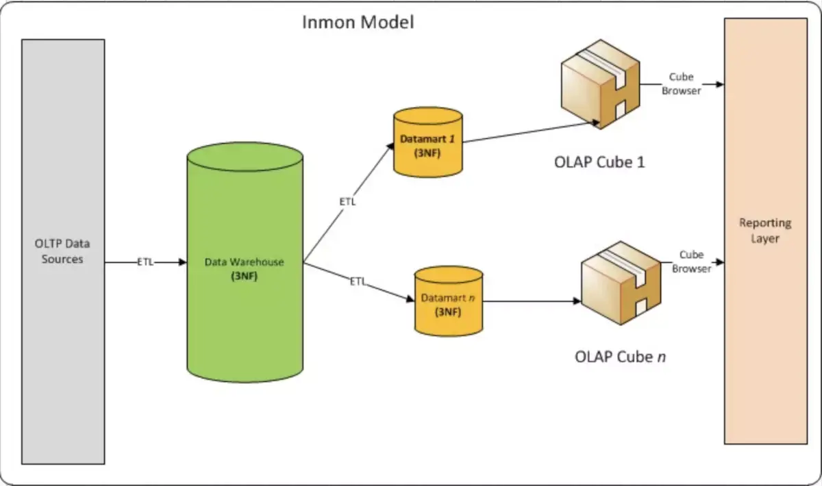 Inmon大爷呢就是数仓之父,他提出的建模方法是从全企业的高度设计一个3NF模型,但是数仓的3NF和OLTP中的3NF的区别在于,它是站在企业的角度面向主题的抽象,而不针对具体业务过程。