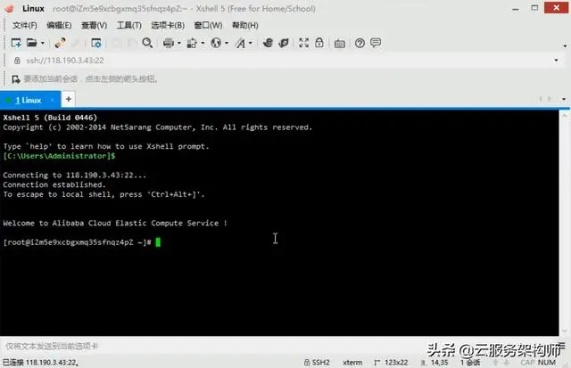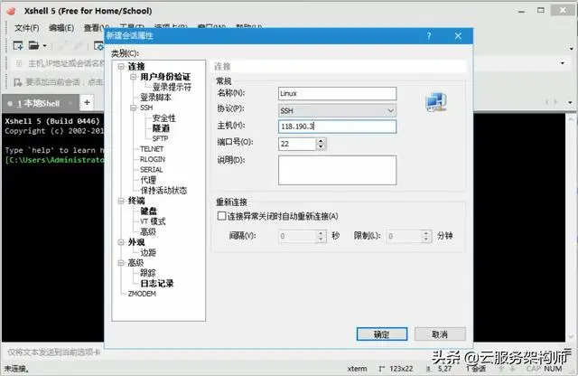 (1)打开Xshell 点击“新建”,然后弹出下图,主机:输入服务器的对公IP地址,默认端口是22.然后点击“确定”