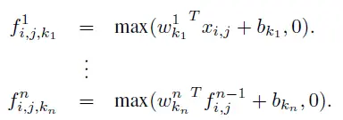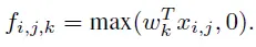 (i, j) 是特征图中像素的位置索引,x_ij 表示像素值,而 k 用于特征图通道的索引,W 是参数,经过 WX 计算以后经过一个 relu 激活进行特征的抽象表示。