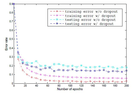 以上曲线对比了有无 Dropout 机制前200 epoch 的错误率,实验结果表明,引入Dropout机制,可以降低测试集 20% 的错误率