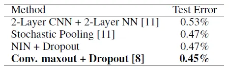 上面对比方法时提到了 maxout,这是是蒙特利尔大学信息与信息技术学院的几位大牛 2013 年在 ICML 上发表的一篇论文,有兴趣的可以看:arxiv.org/abs/1302.43…