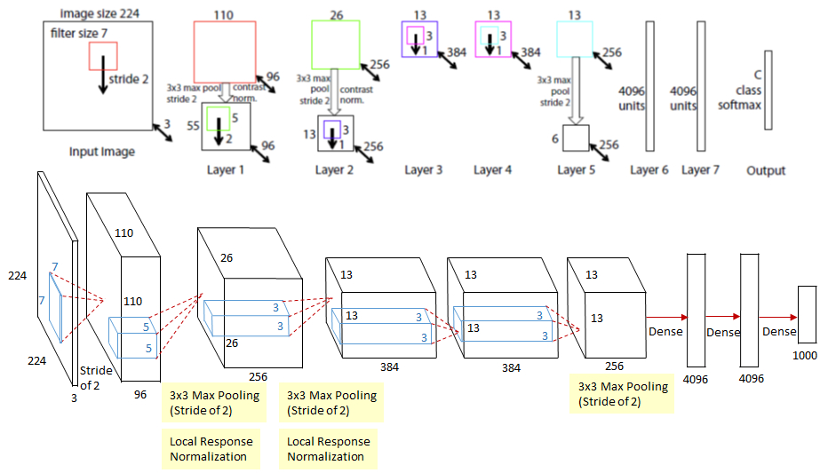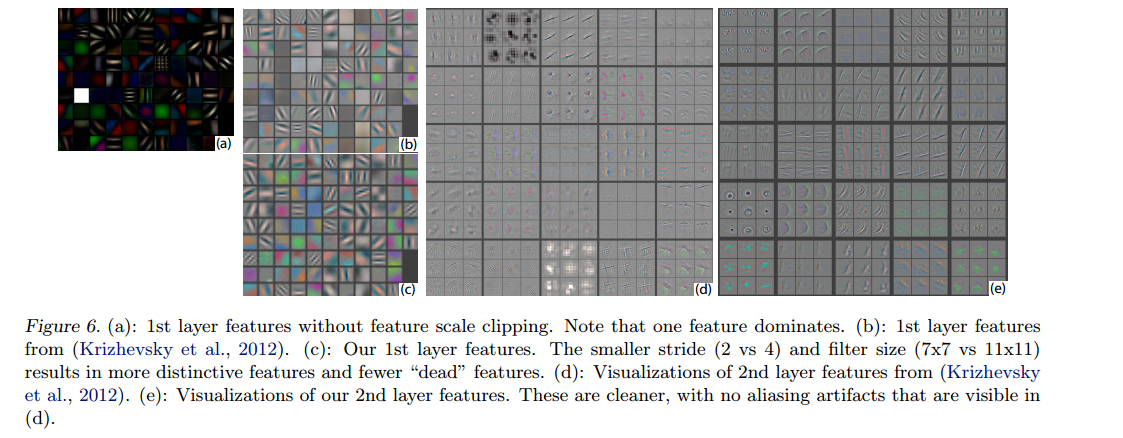 对 AlexNet 改进的地方就是上文提到的(i)将第一层滤波器尺寸从11x11缩小到7x7,并且(ii)使第一层卷积的步幅由 4 改为 2。