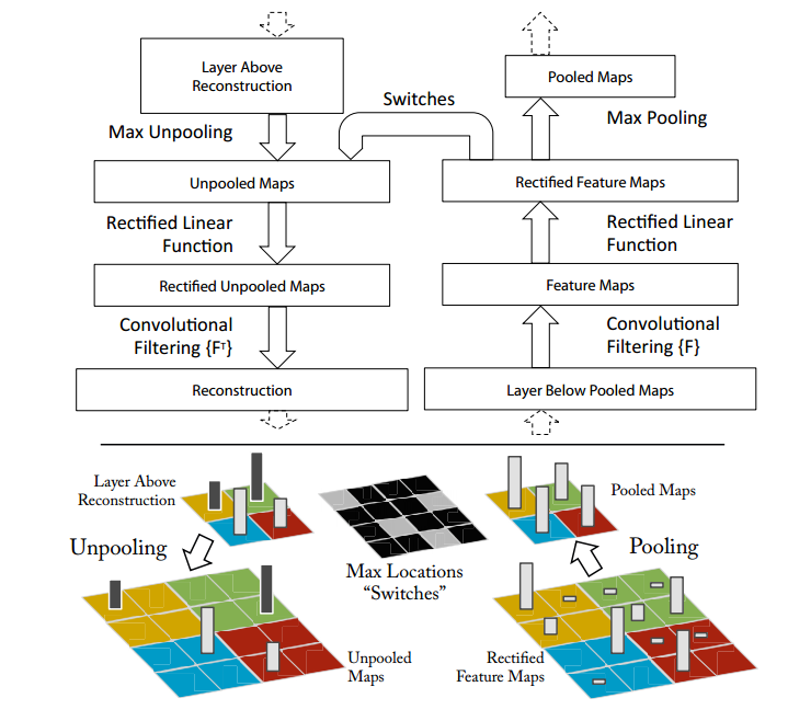 上图:反卷积层(左)与卷积层(右)相连。反卷积网络将从下面的层重建一个近似版本的卷积网络特征。下图:反卷积网络中使用 switch 反池化操作的示意图,switch记录卷积网络池化时每个池化区域(彩色区域)中局部最大值的位置。黑/白条在特征图中表示负/正激活。