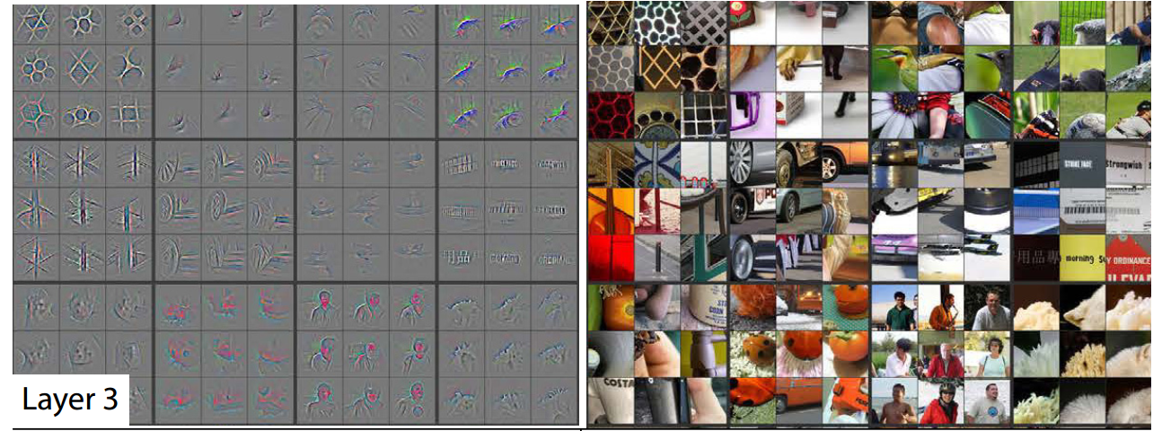 第 3 层具有更复杂的不变性,捕获相似的纹理(例如网格图案(第 1 行,第 1 列);文本(第 2 行,第 4 列))『以下使用 R 代表行,C 代表列』