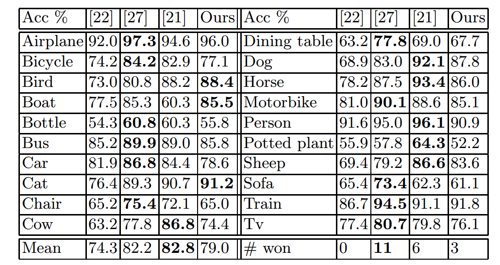 对于PASCAL 2012 来说,PASCAL图像可以包含多个对象,与 ImageNet 中的对象相比与自然有很大的不同。因此,精确度稍低一些,但仍然可以与最先进的方法相媲美。