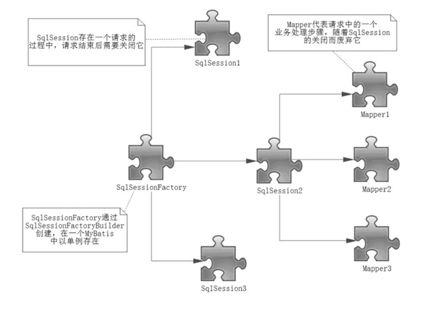 - 所以它应该存活在一个业务请求中,处理完整个请求后,应该关闭这条连接,让它归还给 SqlSessionFactory,否则数据库资源就很快被耗费精光,系统就会瘫痪,所以用 try...catch...finally... 语句来保证其正确关闭