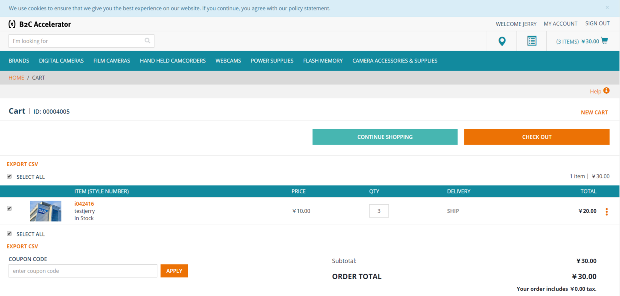 stock level创建完毕后,再到Storefront下单,此时out of stock的错误消息消失: