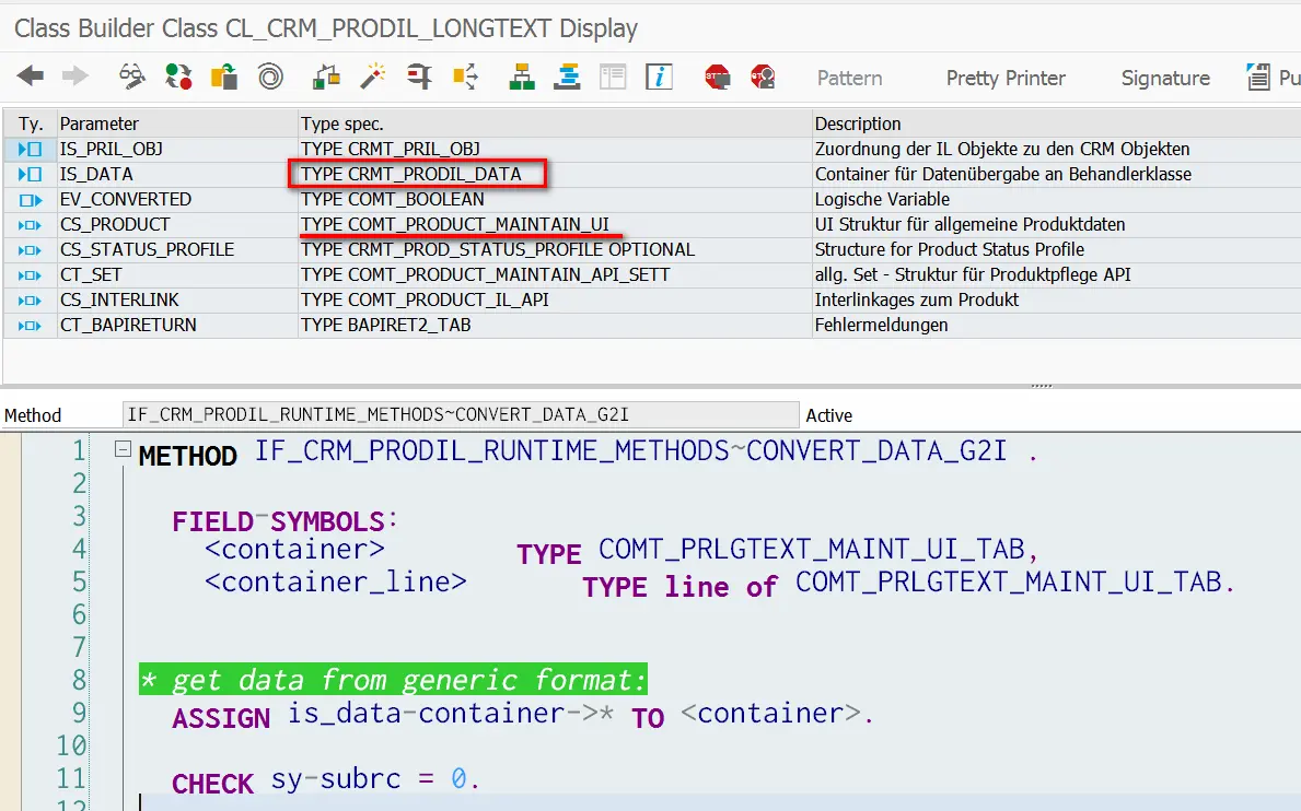 在CRM Genil layer的实现里,虽然没有明文提出DTO的概念,但是从Genil layer这些方法的signature能看出这种DTO的思路其实也是蕴含在其中的:把数据从genil layer的format CRMT_PRODIL_DATA转换成UI layer的COMT_PRODUCT_MAINTAIN_UI.