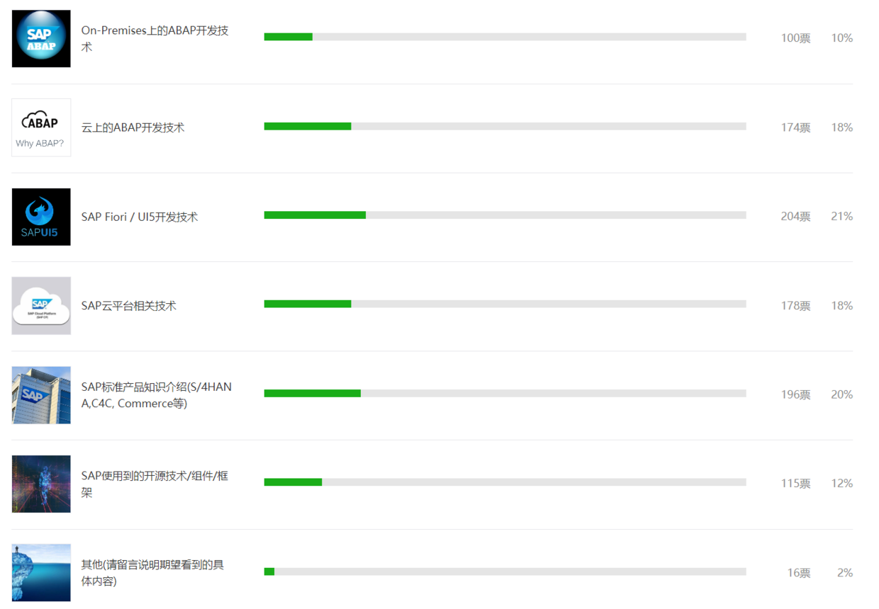 排在第五,第六位的是开源技术和传统ABAP编程技术的分享。伴随着SAP向云端转型,越来越多的SAP产品其底层出现了开源技术的影子,而在SAP研究院内部,不断有业界最新的开源技术应用到了标准开发,部署和交付的流程里。