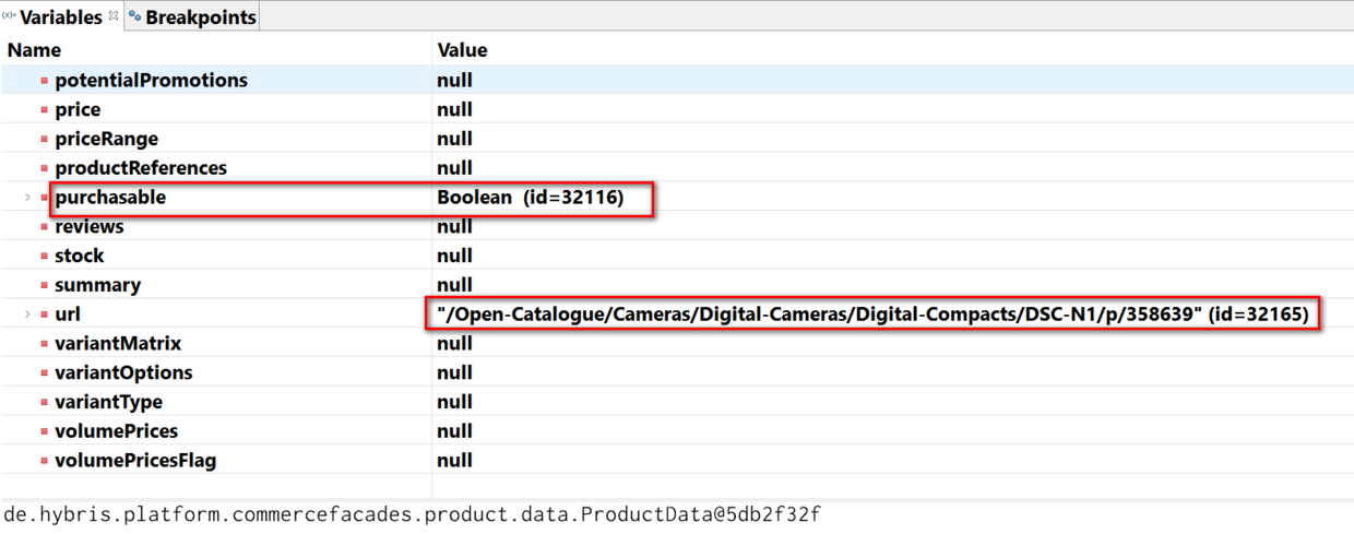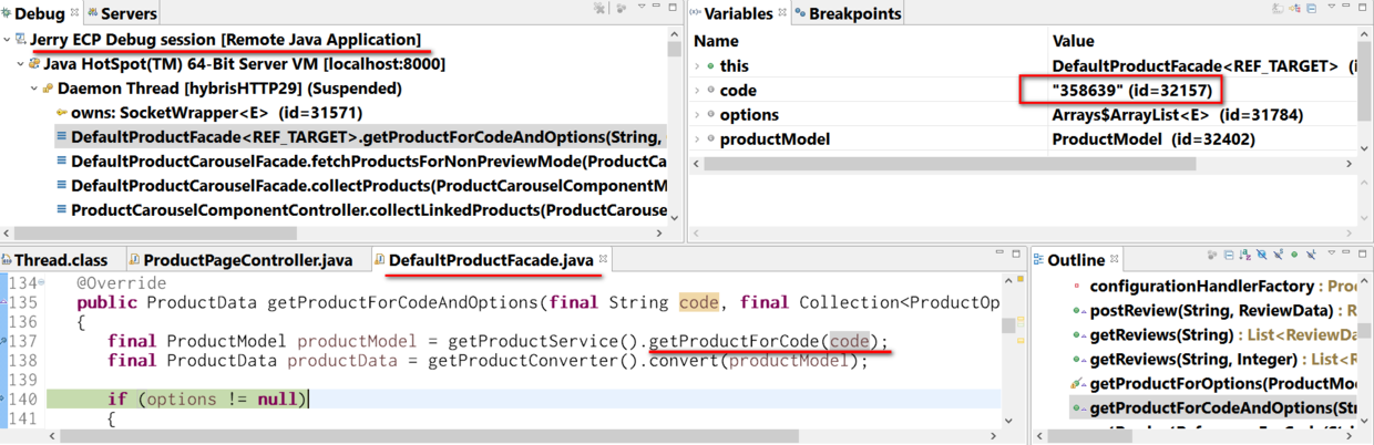 通过debugger观察到Product facade调用ProductService,Service又调用DAO通过flexible search去DB根据product code 358639取数据。